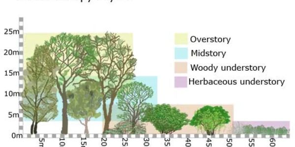 In natural areas, at least in the east, plants have arranged themselves in layers - canopy, shrub, and herbaceous - as in the picture to the left. Some species of wildlife inhabit just one layer, others move up and down throughout their life cycles and some may need wildlife in a layer different than the one they generally occupy.