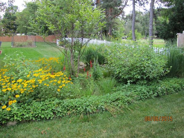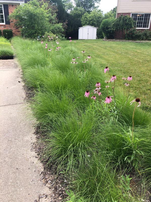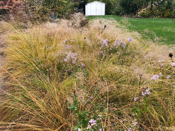 When you have a larger area keep the number of species to a minimum, plant them densely and in drifts so there is little to no space between them. This will provide support and root competition, so plants won't flop. It will look planned and not weedy or messy as the pictures here show.