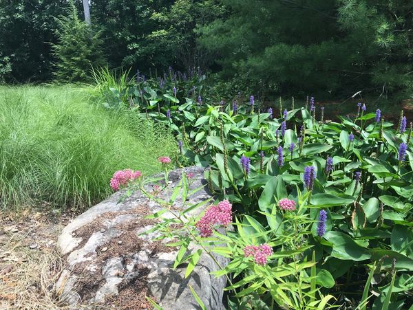 In the picture to the right, Pickerel Weed (Pontedaria cordata), can only survive in standing water. The deadscaper you consult will tell you that you have to change the drainage patterns and get rid of the water. Rather than seeing the water as a feature, they treat it as a waste product.
